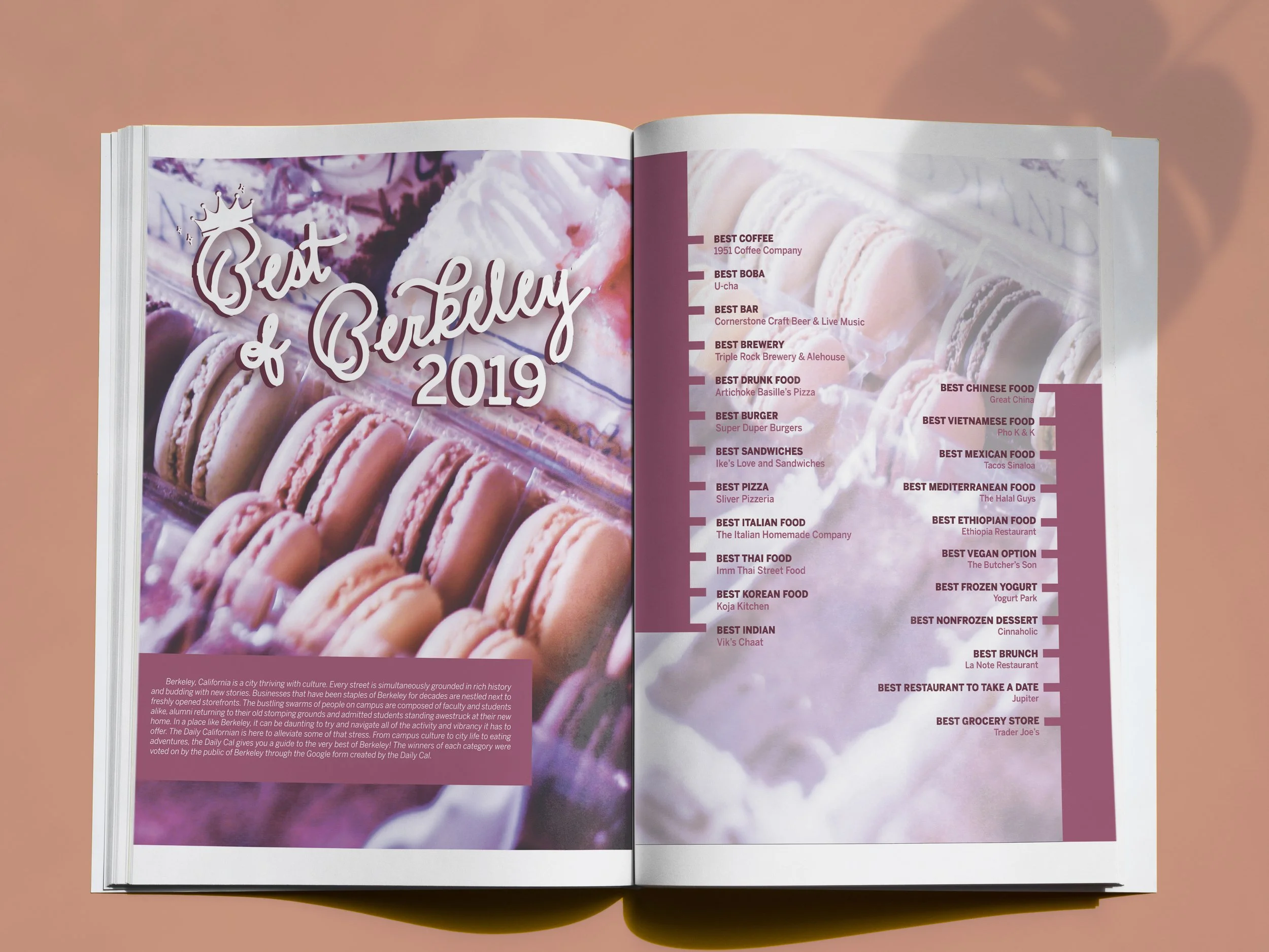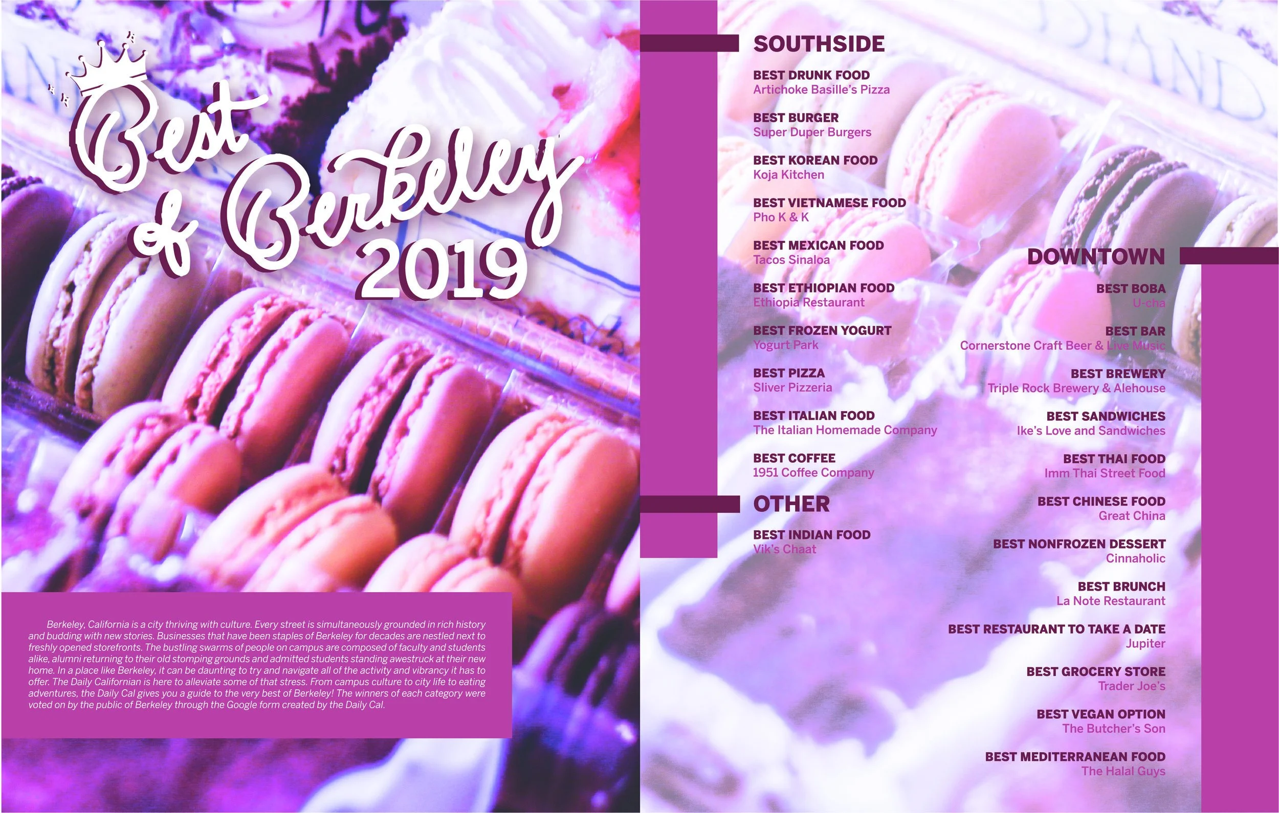 During my time at The Daily Californian as a project manager, I oversaw the end-to-end production of the Food + Drink Guide for 2019. The Food + Drink Guide is a special issue produced by the Daily Californian (an independent student-run newspaper based in Berkeley, CA) every fall. The Food + Drink Guide features the Daily Cal’s Best of Berkeley rankings, recipes, recommendations, and cooking tips. Over 2,000 copies of the guide are distributed to UC Berkeley students and staff, and members of the Berkeley community.