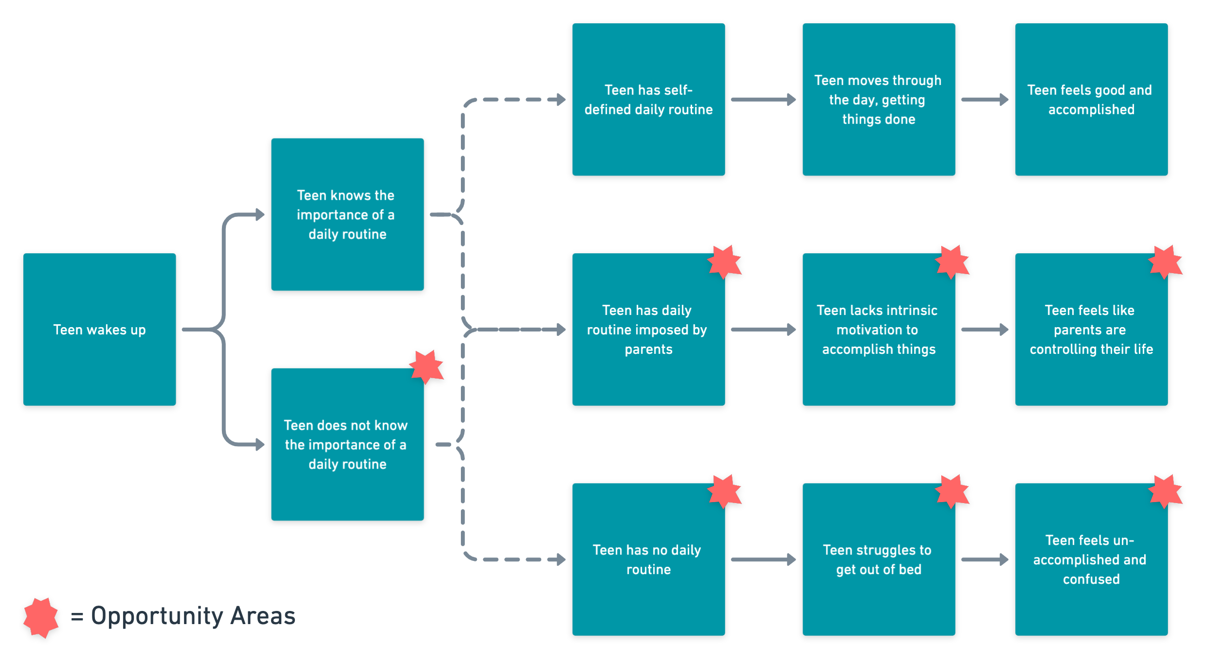 After speaking with teens and their caregivers, teachers and psychologists alike we consolidated our research findings in a couple of journey maps and identified different pain points and opportunity areas within the daily routines of teens.