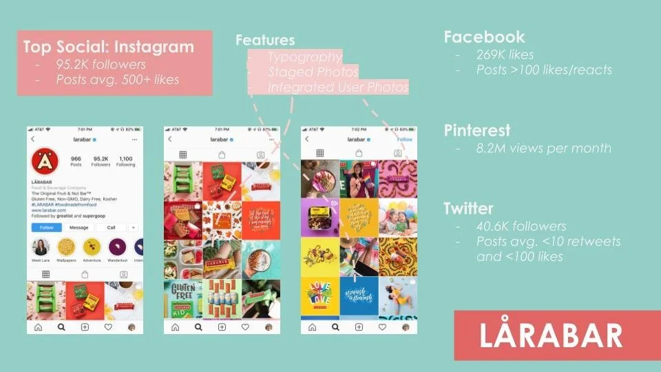 In order to better understand how TIG™ can position themselves and break into the snack/bar industry, we each did a social media competitor analysis on two brands: one in the bar industry and one in the snack industry. The two brands I analyzed were LARABAR and Boom Chicka Pop.